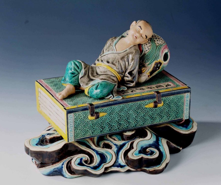 2.其基本的釉色有:白色/古黃/濃綠/海碧/寶藍/紅豆紫/胭脂紅/黑色透明為其基本釉色,另可調配到上百種的釉色,但以我本身在釉色的掌控上,更講究去達到釉彩所欲表現出的質感,綠色則當如碧玉如翡翠;藍色像藍寶一樣;紫如紫晶;紅如胭脂,雖很亮麗,卻有脫俗之感,也因此交趾陶又有"寶石釉"的稱呼。